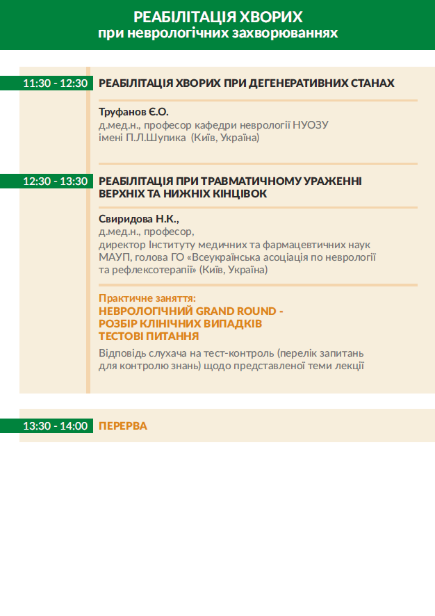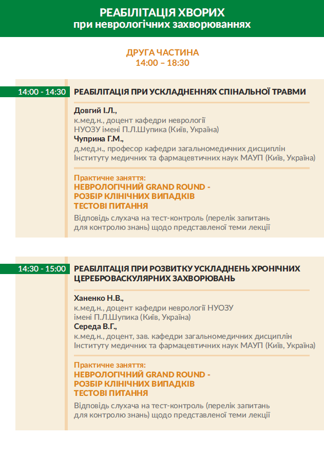 Неврологія, ФРМ, Функціональна діагностика, Фізіотерапія, ЗПСМ,Нейрохірургія, Судинна хірургія, Ортопедія і травматологія, Хірургія, Анестезіологія, Офтальмологія,Кардіологія, Отоларингологія, Психотерапія, Терапія, Акушерство і гінекологія, Урологія, Ендокринологія