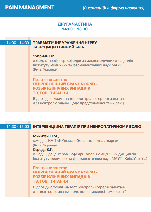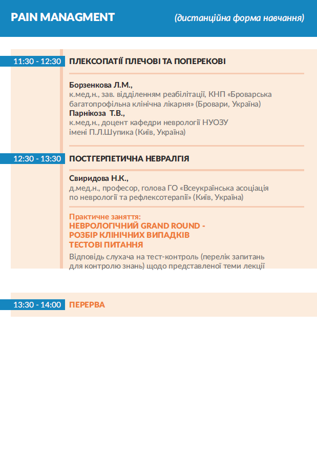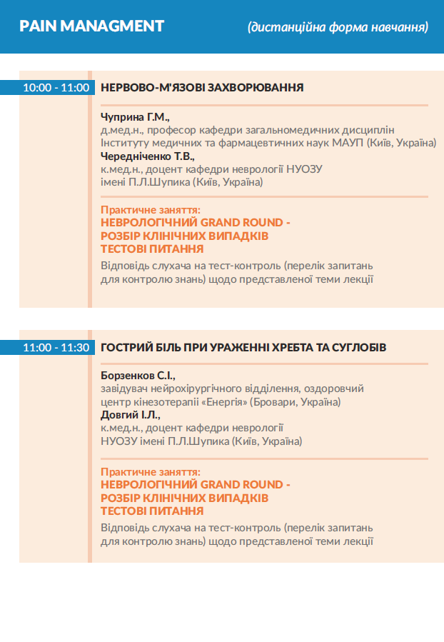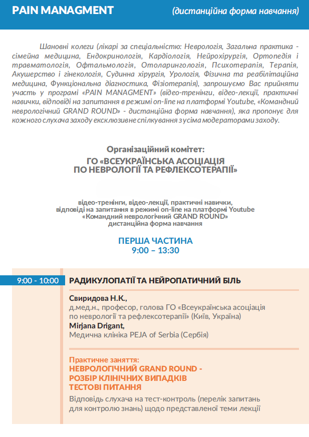 Рain managment: нервово-м'язові захворювання, травматичне ураження нерву та біль; астенія та реактивні стресові розлади, шийна радикулопатія, ускладнення при демієлінізуючих захворюваннях; інтервенційна терапія нейропатичного болю в попереку