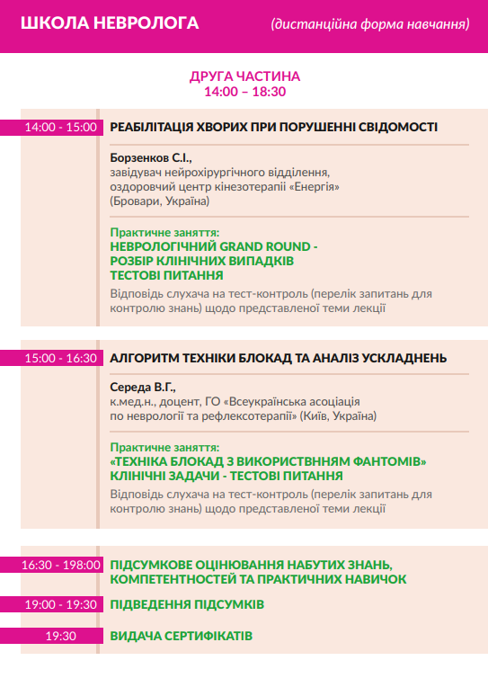 Неврологія, Загальна практика - сімейна медицина, Анестезіологія, Акушерство та гінекологія, Кардіологія, Ендокринологія, Нейрохірургія, Хірургія, Ортопедія і травматологія, Офтальмологія, Отоларингологія, Професійна патологія, Психотерапія, Ерготерапія, Терапія мови та мовлення, Педіатрія, Внутрішні хвороби, Ревматологія, Рефлексотерапія, Судинна хірургія, Урологія, Фізична та реабілітаційна медицина, Функціональна діагностика, Фізична терапія, Спортивна медицина